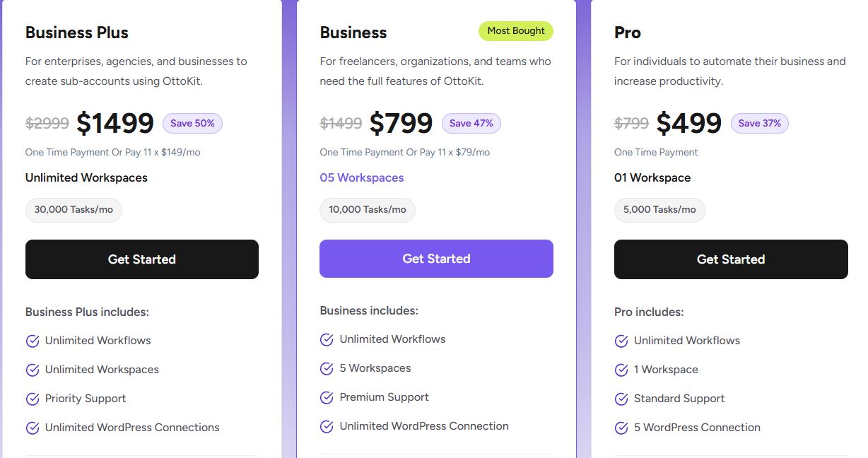 OttoKit is often sold with lifetime deals — one-time payments that unlock broader functionality, task limits, and priority support. These plans have typical tiers such as: