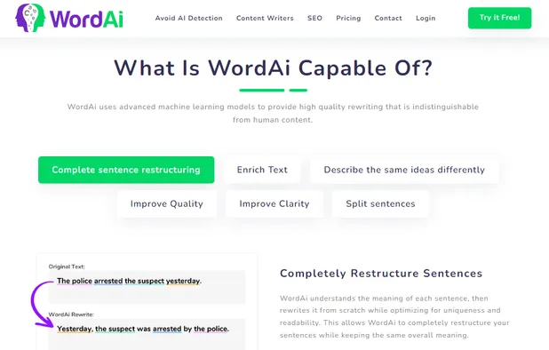 Beyond just changing words, WordAi excels at completely restructuring sentences and paragraphs. It can combine sentences, split long ones, change the order of clauses, and rewrite entire paragraphs while preserving the core message. This level of transformation is critical for creating content that search engines see as genuinely distinct.
